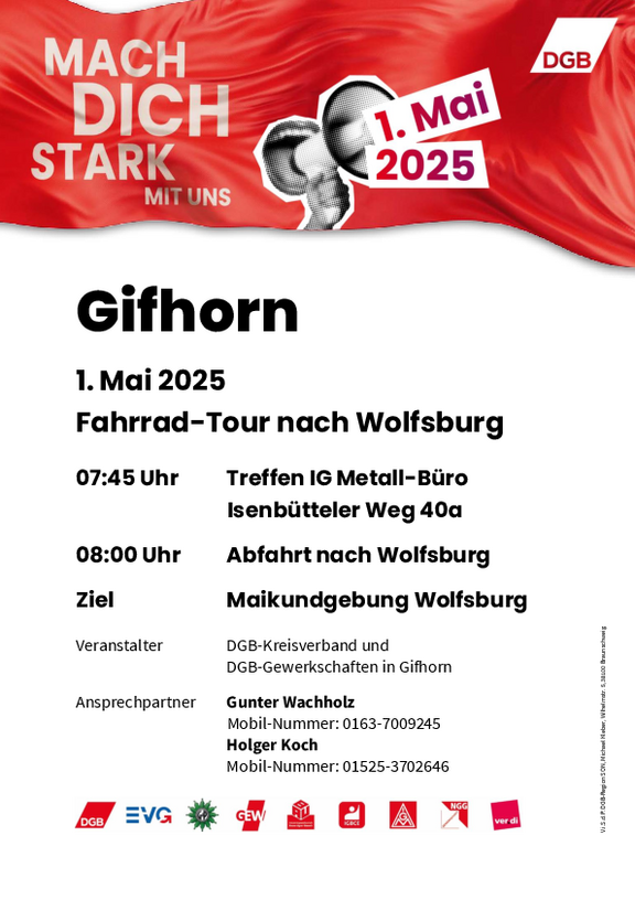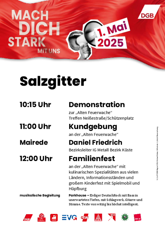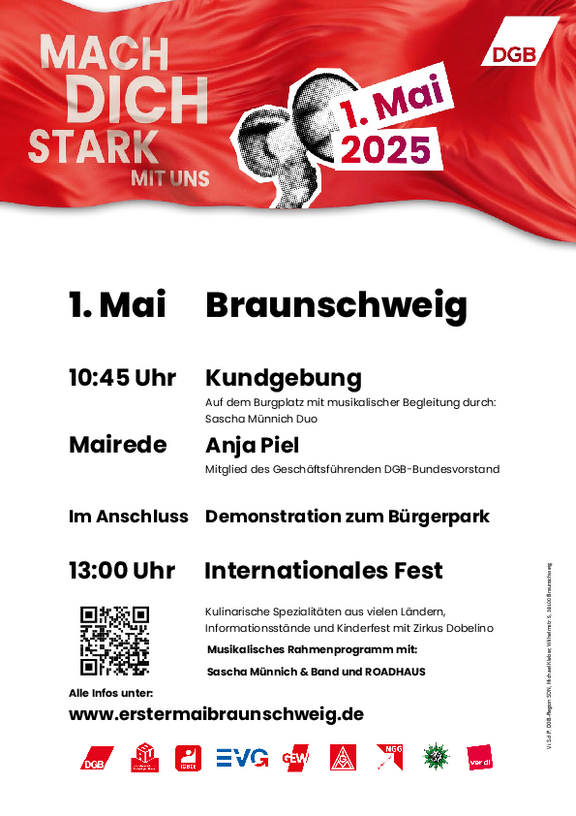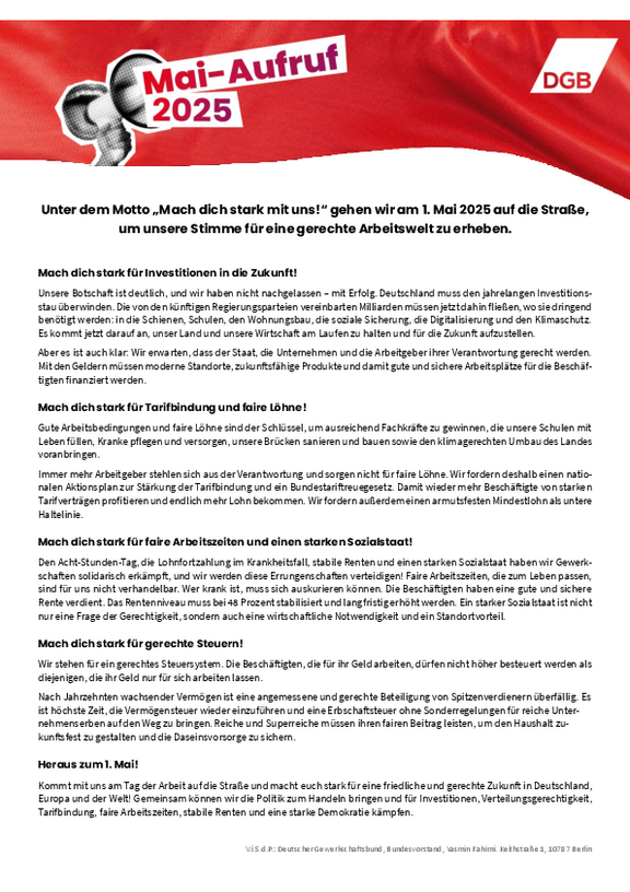 Kommt mit uns am Tag der Arbeit auf die Straße und macht euch stark für eine friedliche und gerechte Zukunft in Deutsch-land, Europa und der Welt! Gemeinsam können wir die Politik zum Handeln bringen und für Investitionen, Verteilungsgerechtigkeit, Tarifbindung, faire Arbeitszeiten, stabile Renten und eine starke Demokratie kämpfen.