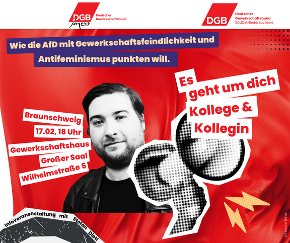 Über diese bedrohliche Entwicklung spricht der Autor und Gewerkschafter Stefan Dietl am Montag, den 17. Februar um 18:00 Uhr im Wilhelm5 in Braunschweig. Dietl ist ein ausgewiesener Kenner der politischen Rechten und insbesondere der AfD. Er wird anhand konkreter Beispiele aufzeigen, wie die Partei versucht, den Einfluss von Gewerkschaften zu schwächen und gleichzeitig mit rückwärtsgewandten Geschlechterstereotypen Politik macht. Zudem gibt er Anregungen und Argumentationshilfen, um sich mit Kolleg*innen zu diesen Themen auszutauschen und Gegenstrategien zu entwickeln.