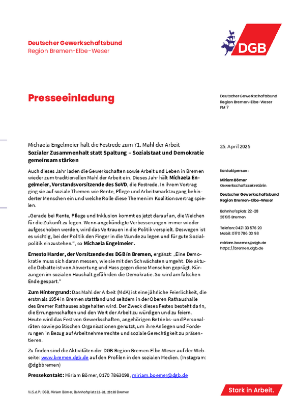 Zum Hintergrund: Das Mahl der Arbeit (MdA) ist eine jährliche Feierlichkeit, die erstmals 1954 in Bremen stattfand und seitdem in der Oberen Rathaushalle des Bremer Rathauses abgehalten wird. Der Zweck dieses Festes besteht darin, die Errungenschaften und den Wert der Arbeit zu würdigen und zu feiern. Heute wird das Fest von Gewerkschaften, angehörigen Betriebs- und Personalräten sowie politischen Organisationen genutzt, um ihre Anliegen und Forderungen in Bezug auf Arbeitnehmerrechte und soziale Gerechtigkeit zu präsentieren.