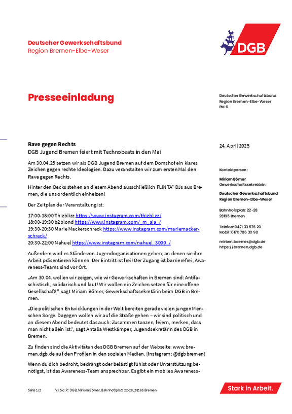 Weitere Infos zur Veranstaltung finden sich auf der Webseite: www.bremen.dgb.de/rave-gegen-rechts auf den Profilen in den sozialen Medien. (Instagram: @dgbbremen)